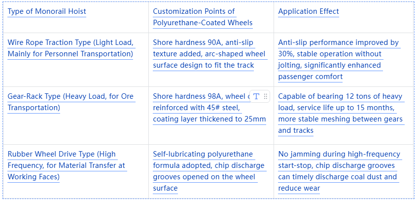 A coal mine in Shanxi with an annual output of 5 million tons originally used steel wheels for its 3 underground gear-rack monorail hoists, which had problems such as high noise, rapid track wear, and monthly shutdowns for wheel replacement. After introducing customized polyurethane-coated wheels in 2023, three core improvements were achieved:
